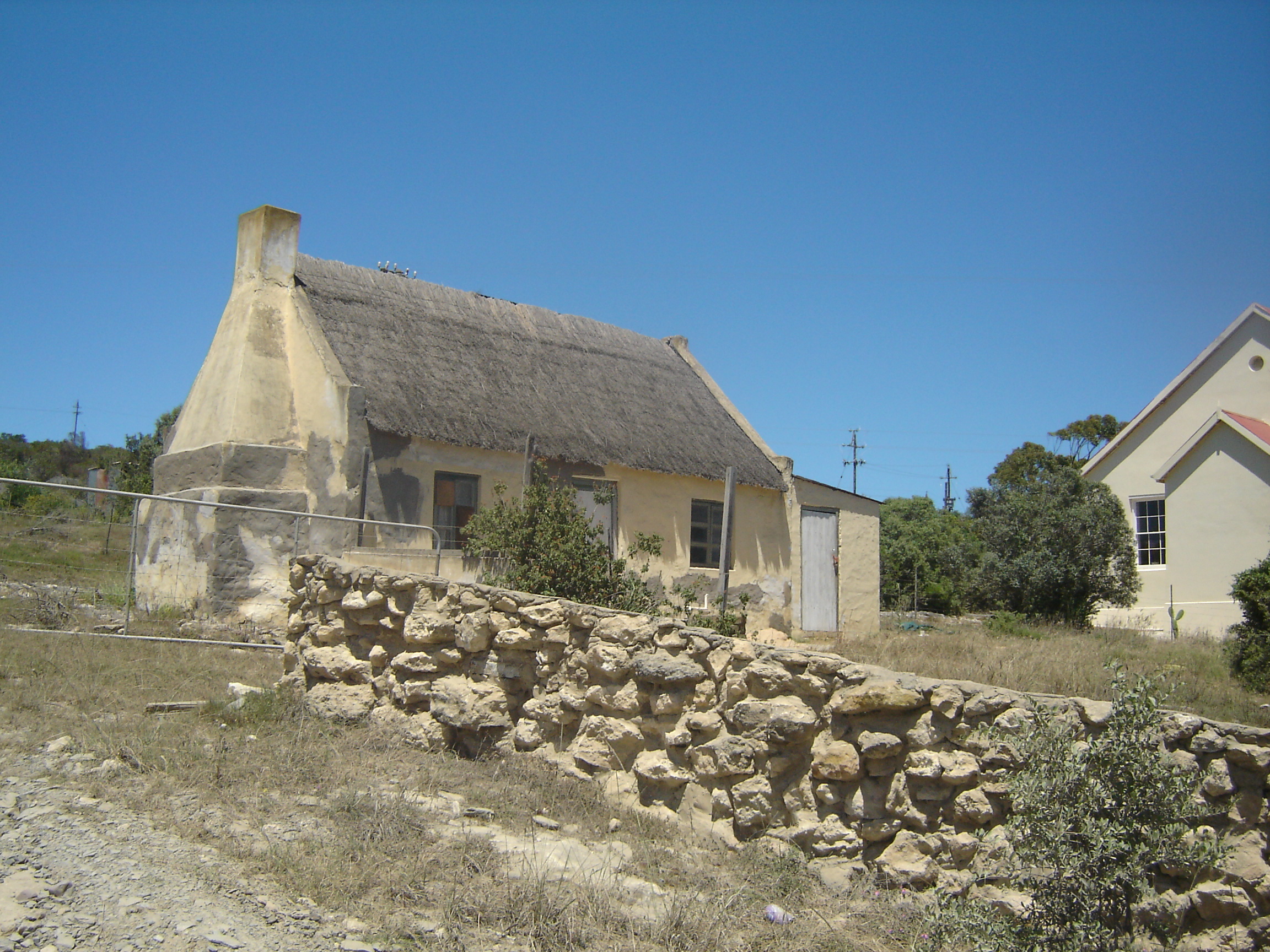 In effect, Vermaaklikheid is a forgotten place. A ramble along the peaceful sandy track between the river and the village takes you past shuttered cottages and farmhouses with rows of rusty implements lining saggy fences in overgrown gardens. Notably, some of these houses display architectural features that are unique to the village and the nearby seaside hamlet of Puntjie. (In particular, this applies to the way that buildings are thatched with a distinctive additional ridge at the top that has apparently also only ever seen in a single district in Holland.) Ancient rock walls surround vacant paddocks, and weeds and wildflowers have invaded forsaken vineyards and once-ploughed fields, albeit prettily.