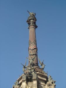 Christopher Columbus points towards the west (which he thought was the east) and towards the Crystal Serenity, docked at briefly at Barcelona before heading off back into the ocean, without me.